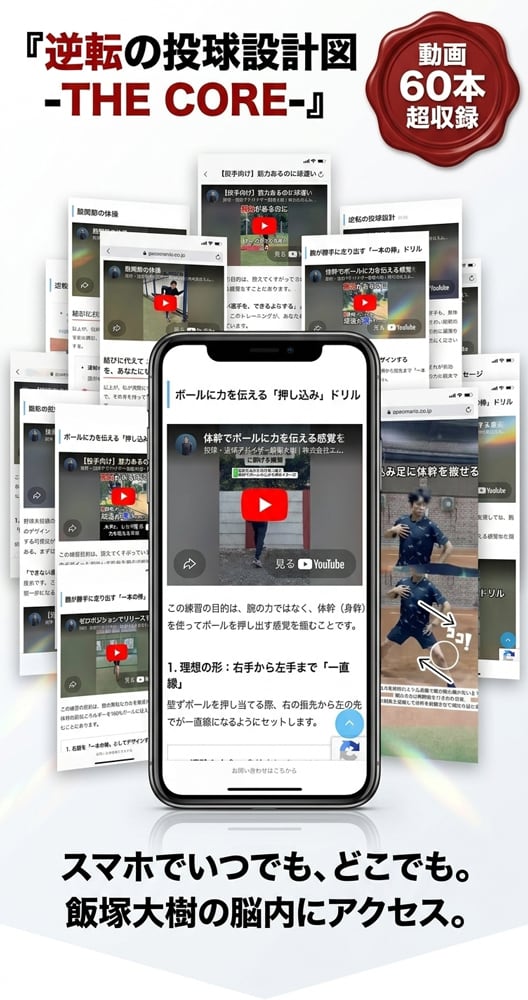 「下半身の使い方」「腕のしなりの作り方」「怪我をしないゼロポジション」など、145km/hに到達するために必要な要素を、約60本の動画で徹底解説しています。