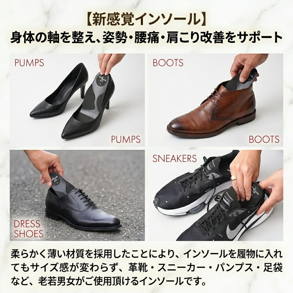 軸が土踏まずの中心に整うことで、 猫背や歩行の改善への期待、腰痛 ・ ひざ痛や肩こりの軽減、足が浮腫みにくくなるのをはじめとして、人間の運動パフォーマンスのアップと怪我の予防、日々の生活での使用によるリカバリーを通し、人間本来の重心バランスに戻すのが真軸インソールです。